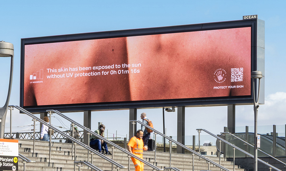 The British Skin Foundation’s innovative installation display uses AI technology and thousands of interpolated images. An AI model, developed in collaboration with a dermatologist, has been trained to produce realistic depiction of sun damage, across three different skin tones. Starting with images of healthy, undamaged skin, and working closely with a dermatologist, accurate key frames showing each stage of sun damage were created. The AI then accurately burns the skin in real-time, based on the live UV around the billboard.