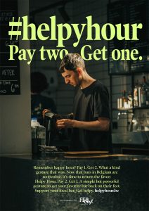 It’s not just in Northern Ireland where the on-trade industry has suffered and innovation has been the result. Brussels agency, Happiness, part of FCB, has created a campaign for trade association FedCaf Belgium urging happy punters to ‘pay two, get one’. The idea behind the ‘helpy hour’ is to turn the happy hour on its head and give something back to much loved venues as they find their feet in a new and socially distant world. It’s been estimated that as many of half of the 12,000 cafes in Belgium might not survive the crisis.