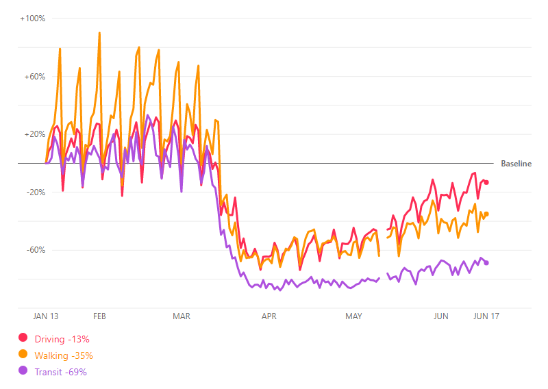 Audiences around grocery and pharmacy locations remain high, albeit slightly lower than the baseline. Pedestrian activity around these locations grew by 1% from last week, to 87%. Activity levels in retail and recreation locations also increased, up 13% from the previous week to reach 50% of the pre-pandemic baseline, with data until 14th June. Major retailers including Primark didn’t reopen immediately, so we anticipate further growth for the retail industry.