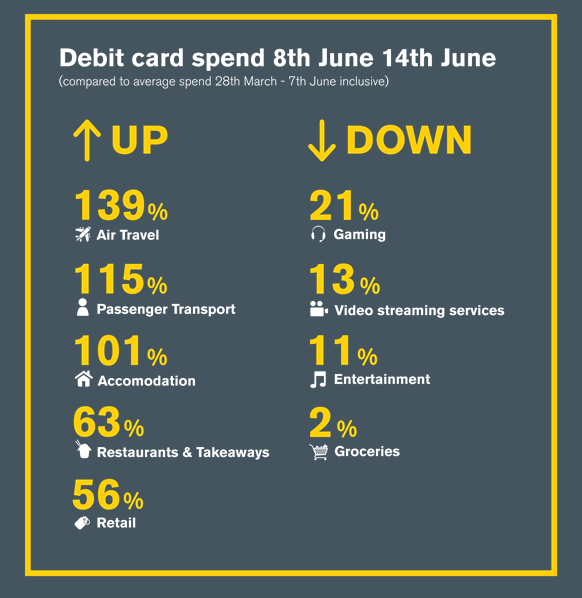 Additionally, air travel is picking up again. Loganair, the airline which took over some of the Flybe routes from GBBCA, announced the addition of a Glasgow to Belfast route, which will operate twice daily, 6 days per week from September. Flights to Aberdeen and Inverness, which were paused during the Covid-19 lockdown will resume from 6th July. EasyJet flights from Belfast International Airport also resumed this week, with Jet2 and Ryanair following. Irish audiences are also keen to get back in the skies, with analysis of debit card spending from Bank of Ireland showing spend on air travel has increased by 139%, from an average baseline figure during lockdown. Irish consumers are also keen to get away to hotels, with spending up 101% from the baseline. With increasing numbers visiting urban areas to shop and work, it’s unsurprising that passenger transport spending also rose by 115%.